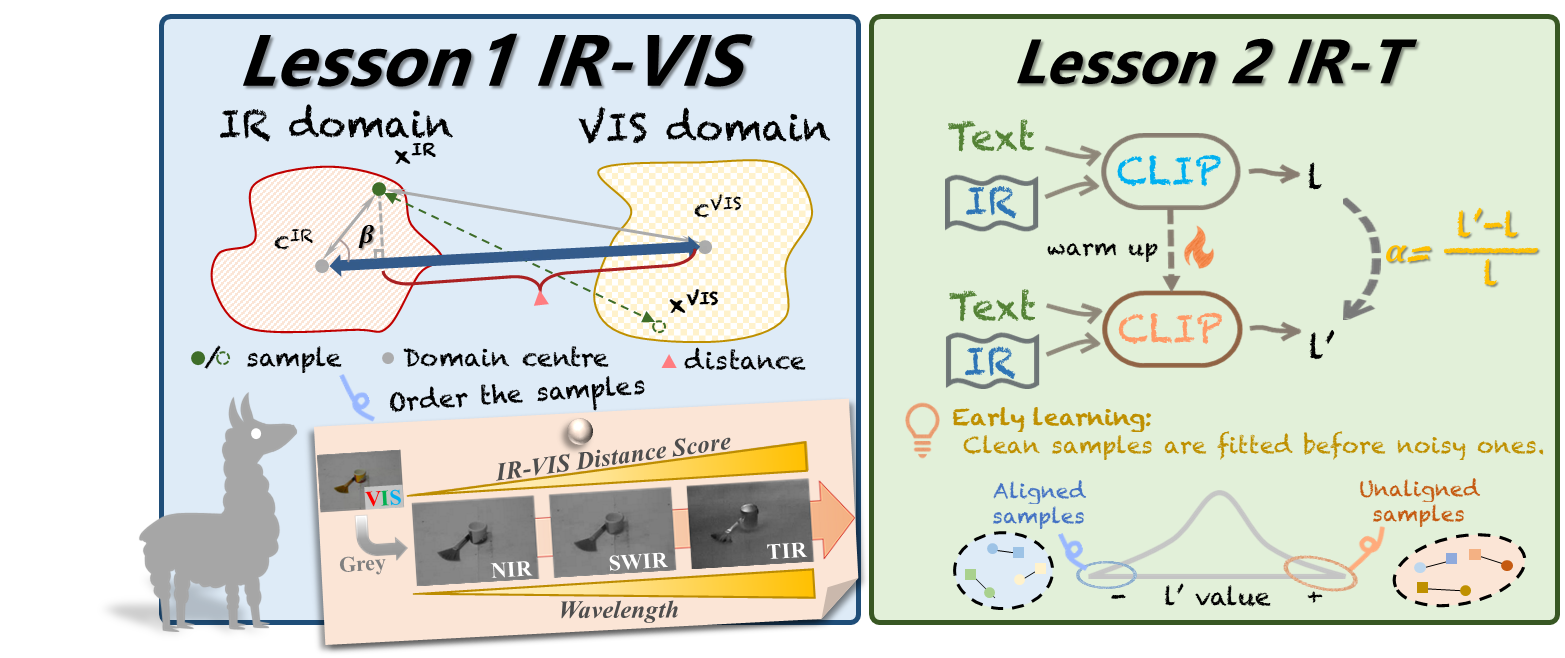 在模型训练方法上,团队创新性地提出了双跨模态课程迁移学习(Bi-cross-modal Curriculum Transfer Learning)框架(如图2所示),通过可见光–红外–文本三者间的双向课程学习,实现了从简单到复杂的知识迁移过程。框架的第一阶段(IR–VIS)以几何度量计算红外与可见光图像的域差,帮助模型建立红外视觉表征;第二阶段(IR–T)基于预训练CLIP模型动态损失变化率,评估红外图像与文本的语义对齐难度,并通过自适应加权提升跨模态匹配能力。这一渐进式迁移机制使得模型能够逐步掌握红外场景中的热辐射特征和语义结构。
